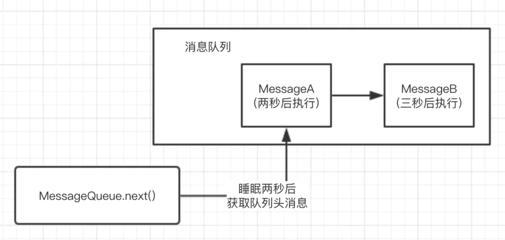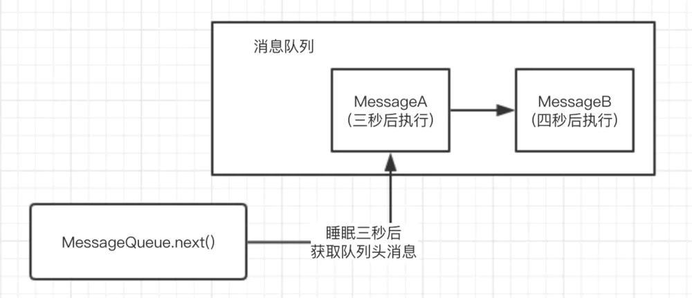 首先假设队列里面有两个消息,分别在三秒、四秒之后执行,也就是说MessageQueue.next的线程会睡眠三秒之后才去消息队列拿队列头的消息: