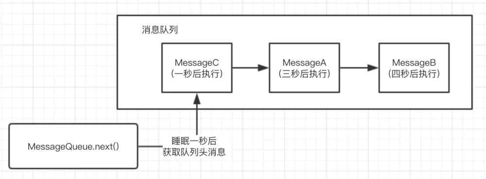 等了一秒之后MessageQueue.next的线程自己苏醒拿出队列头的MessageC去分发,然后继续拿MessageA。但是发现时间又没有到,于是又会再睡眠两秒: