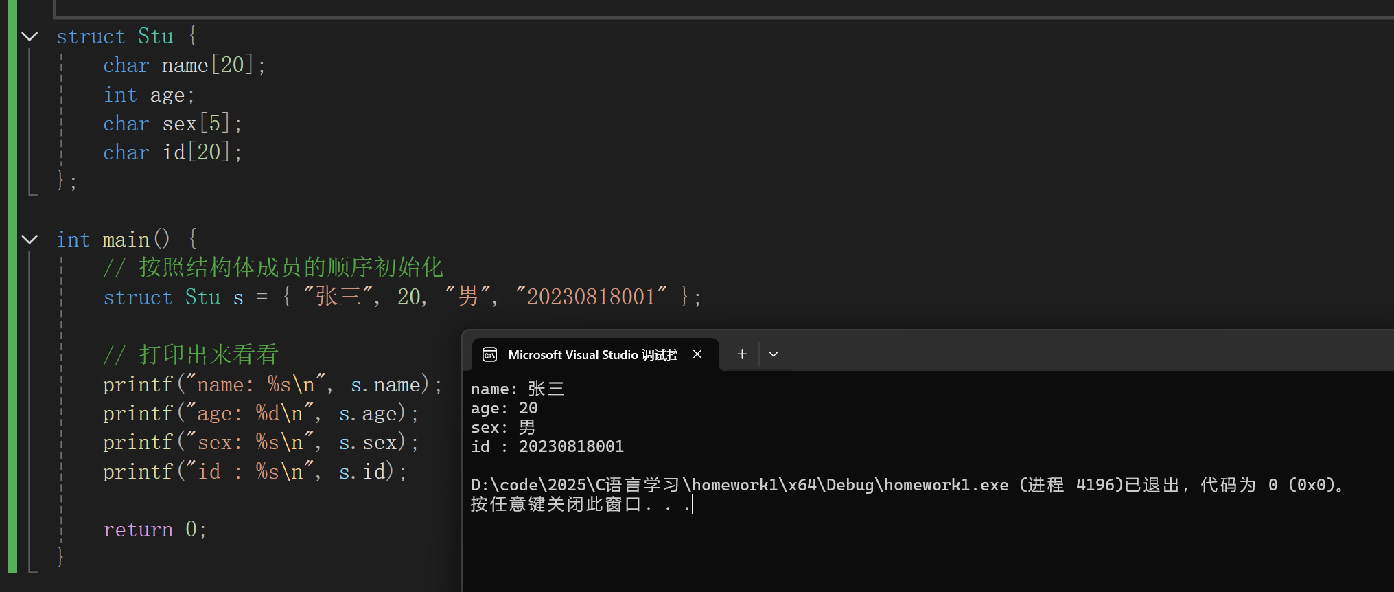 struct Stu s = {"张三", 20, "男", "20230818001"};
