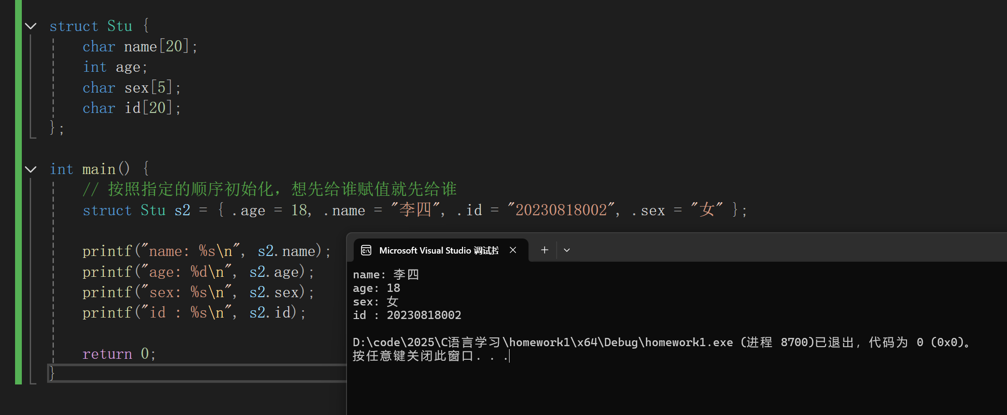 struct Stu s2 = {.age = 18, .name = "李四", .id = "20230818002", .sex = "女"};