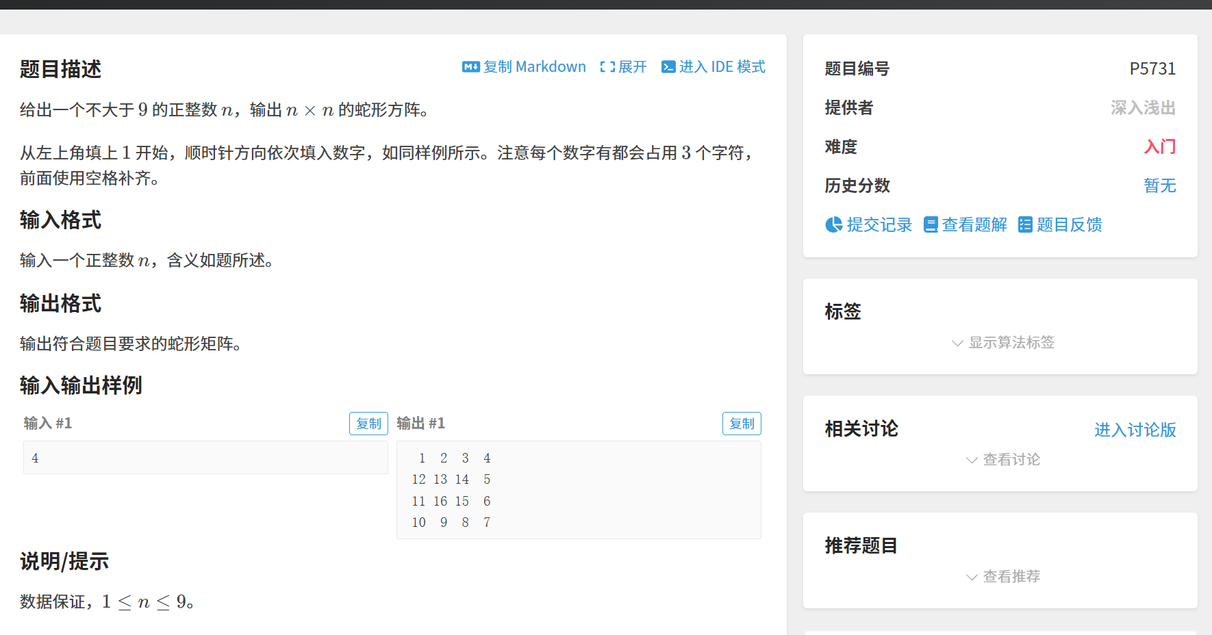 进阶例题:蛇形方阵(洛谷 P5731)
