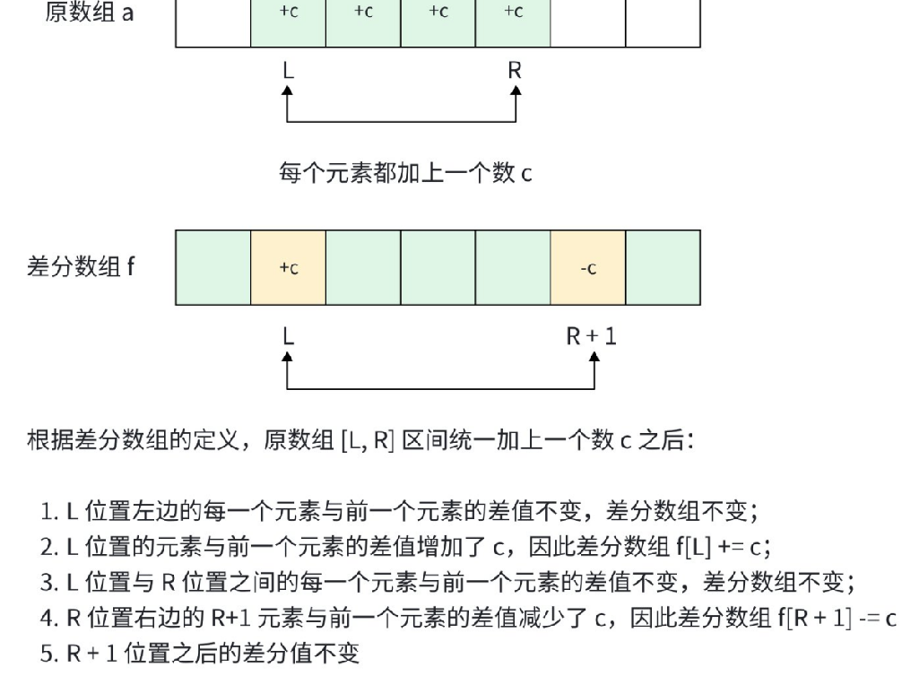 根据差分数组的性质处理 q 区间修改:f[L] + = c, f[R + 1] − = c