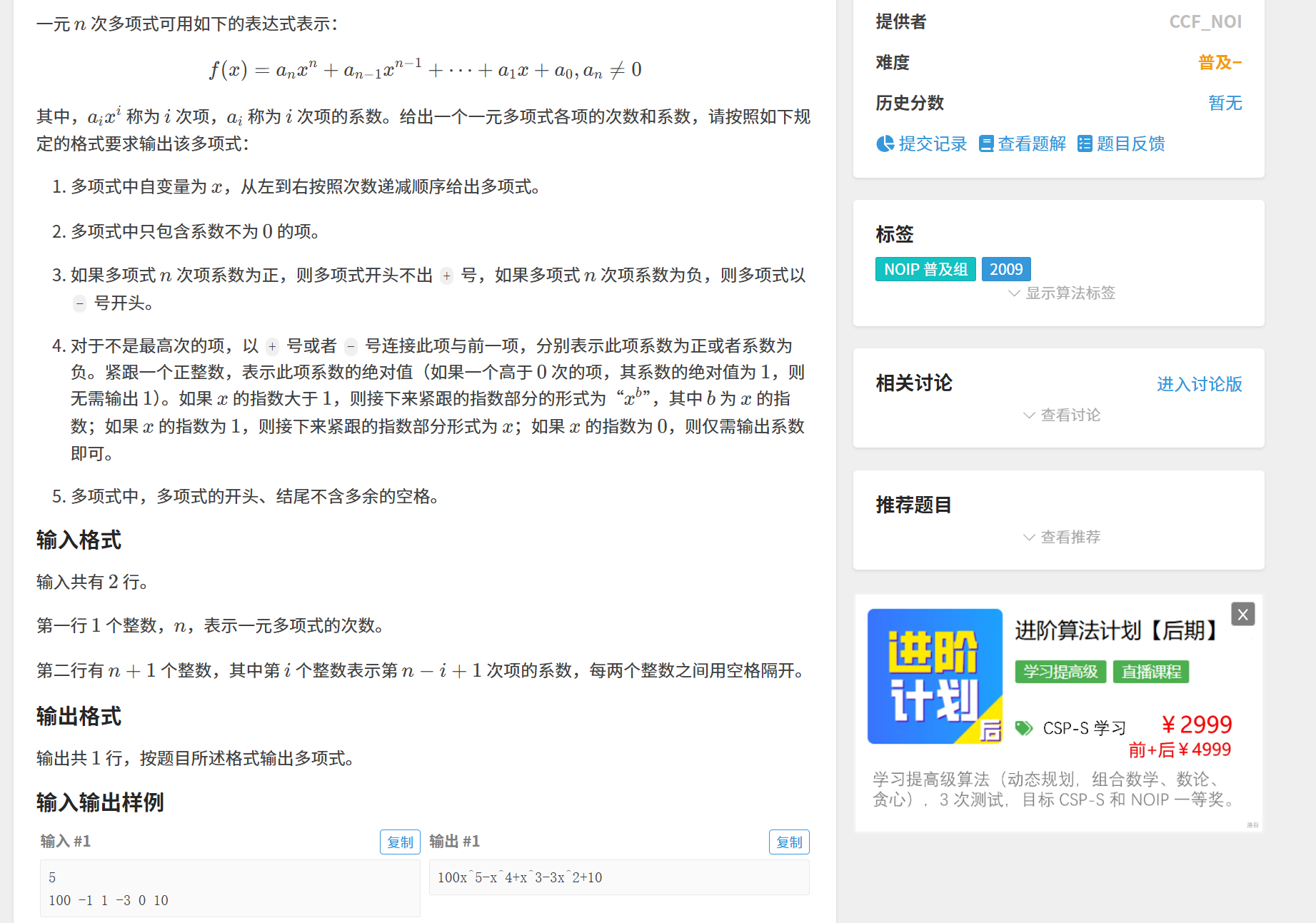 题目大意:给定一元 n 次多项式的系数,按规范格式输出(如