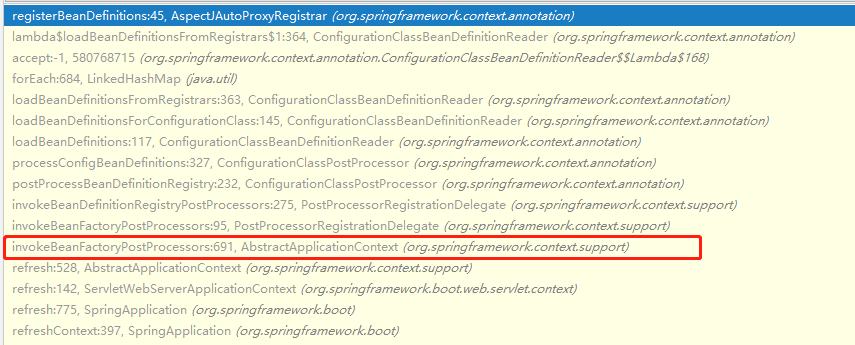 }我们在AspectJAutoProxyRegistrar类的registerBeanDefinitions方法上打个断点,启动一下服务,可以看到通过容器刷新方法中的invokeBeanFactoryPostProcessors这一步,最终会走到AspectJAutoProxyRegistrar类的这个