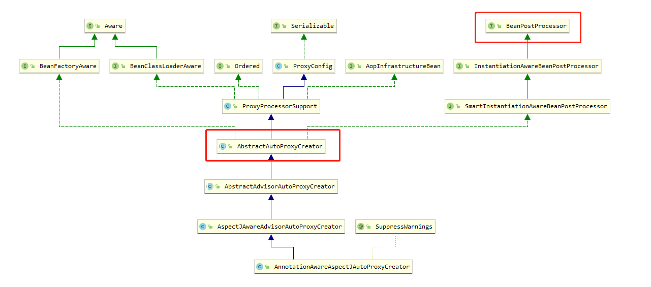 }这个时候,AnnotationAwareAspectJAutoProxyCreator已经放到了beanDefinitionMap里,等待被实例化和初始化,那么AnnotationAwareAspectJAutoProxyCreator是在什么时候实例化和初始化的呢,我们先看下AnnotationAwareAspectJAutoProxyCreator的类图