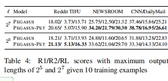 考虑到所有任务的R1/R2/RL分数和训练集的大小;所有的结果都在三个不同设置的训练集(zeroshot,10shots,100shots)上取平均值。最后一列显示了所有数据集上的平均性能。