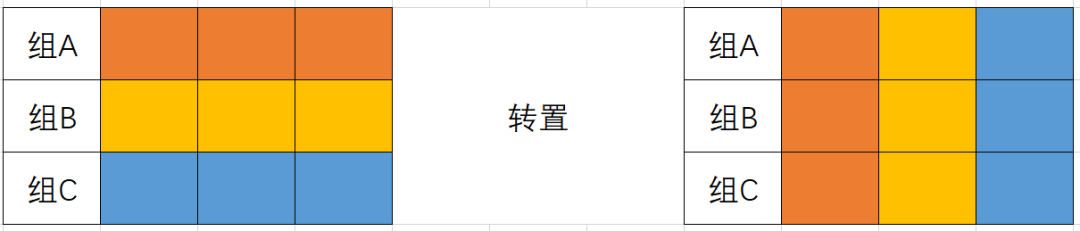 经过对原始数据做转置(行与列互换)之后,可以看到每一组中都包含三种颜色的数据,也就完成了转置前不同组间的信息交流。