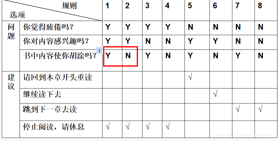 条件桩—列出问题的所有条件。 条件项—针对条件桩给出的条件,列出所有可能的取值。 动作桩—列出问题规定的可能采取的操作。 动作项—指出在条件项的各组取值情况下应采取的动作。