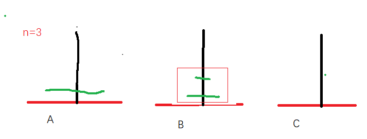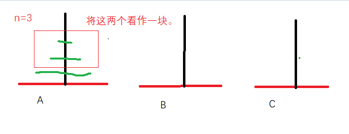 下面是人脑的思考过程(实际上人脑也有这个过程,但是自己是很难将这个过程理解为递归,而是换换换,再往C或者B放都是需要思考,如果n=4,甚至更多,脑子就不够用了。