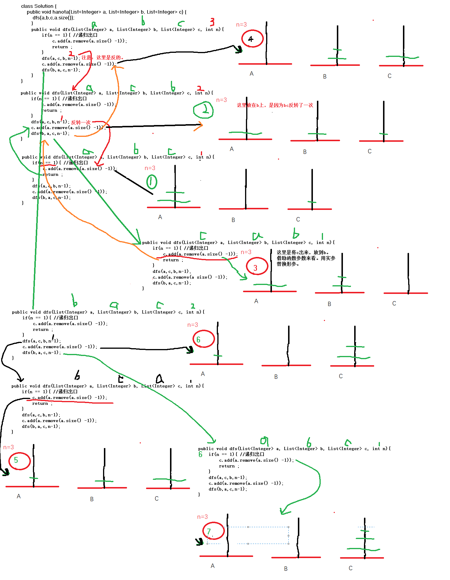 dfs(a,c,b,n-1);//这里是将A中最上面的n-1个盘子挪到B中