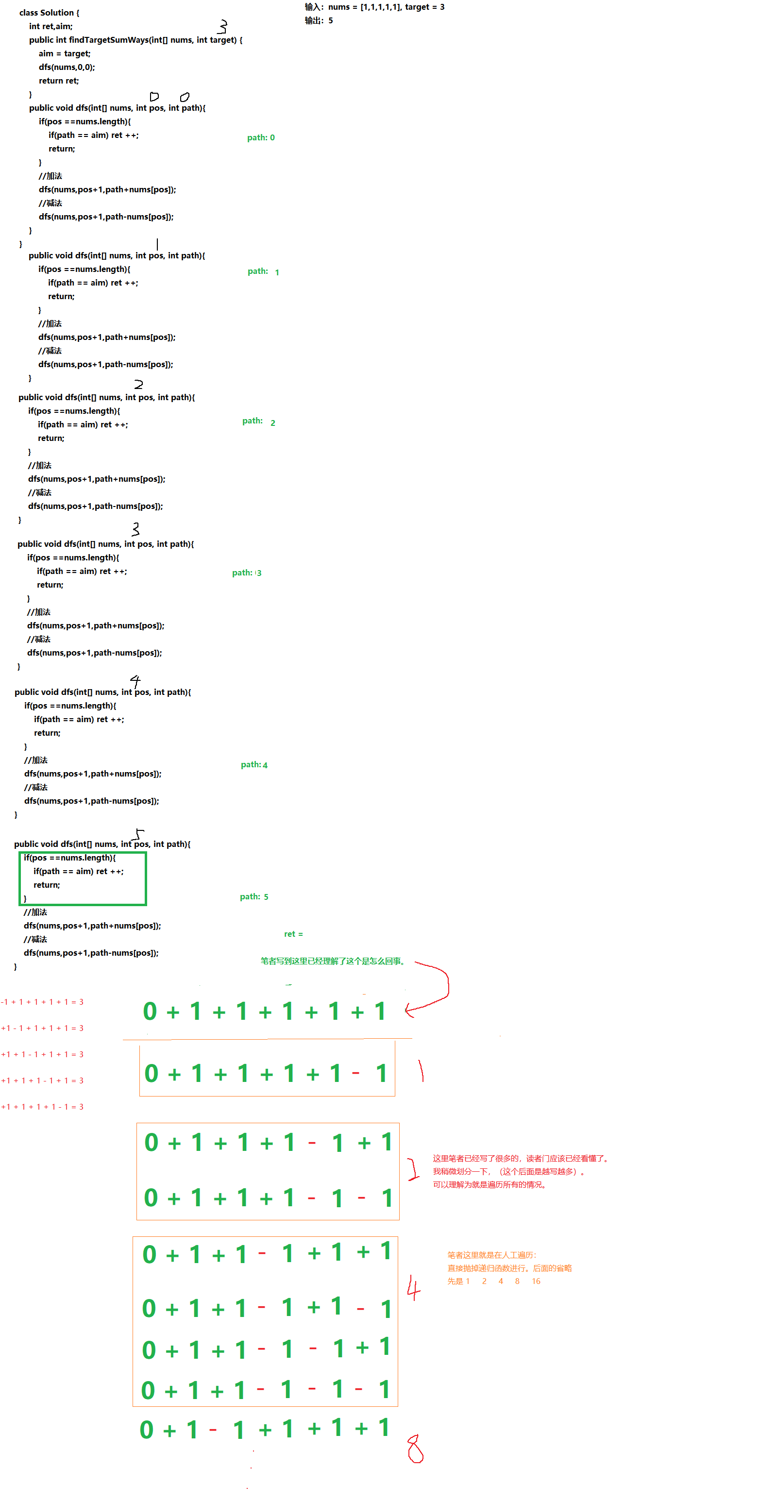 a. 传入参数:index(当前要处理的元素下标),sum(当前状态和),nums(元素数组),aim(目标值:(sum+target)/2);
