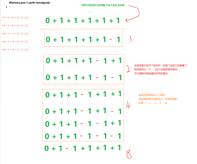 对于每个数,可以选择加上或减去它,依次枚举每一个数字,在每个数都被选择时检查得到的和是否等于目标值。如果等于,则记录结果。
