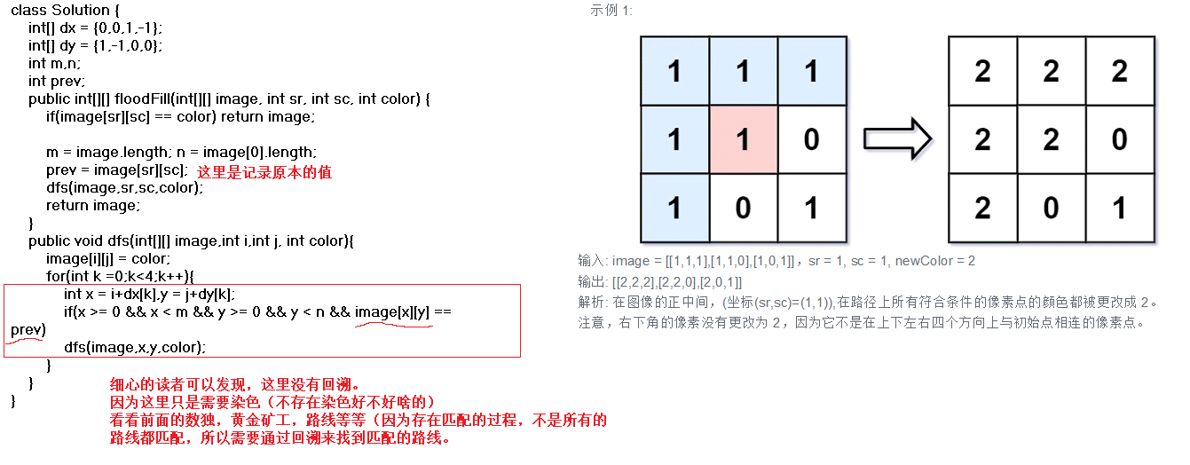 可以利用「深搜」或者「宽搜」,遍历到与该点相连的所有「像素相同的点」,然后将其修改成指定的像素即可。