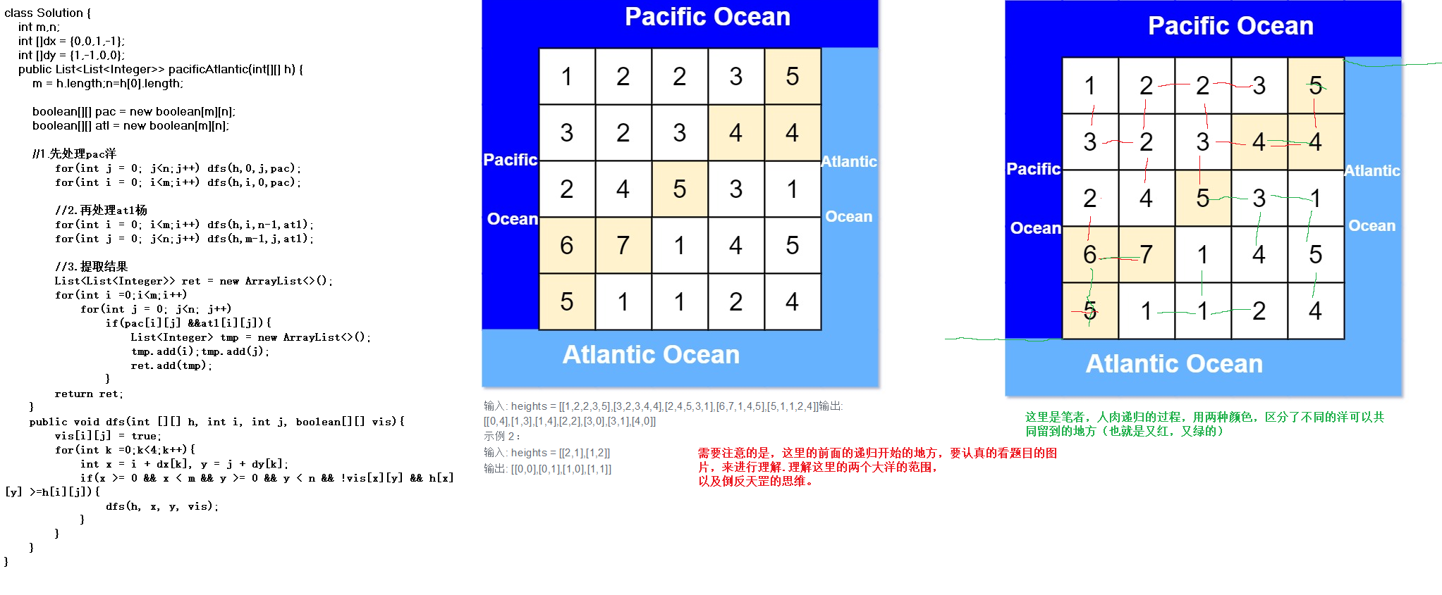 岸也反向 dfs ,这样就能找出那些点可以流向太平洋。那么,被标记两次的点,就是我们要找的结