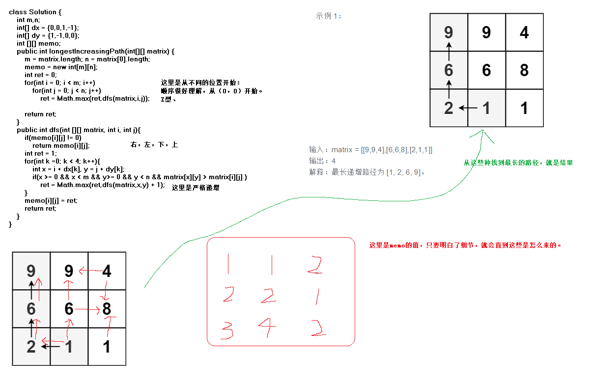 a. 递归含义:给 dfs 一个使命,给他一个下标 [i, j] ,返回从这个位置开始的最长递增路径 的长度;