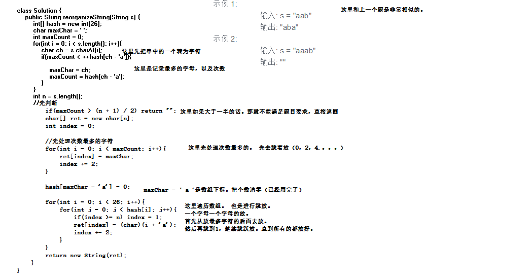 给定一个字符串 s ,检查是否能重新排布其中的字母,使得两相邻的字符不同。 返回 s 的任意可能的重新排列。若不可行,返回空字符串 "" 。