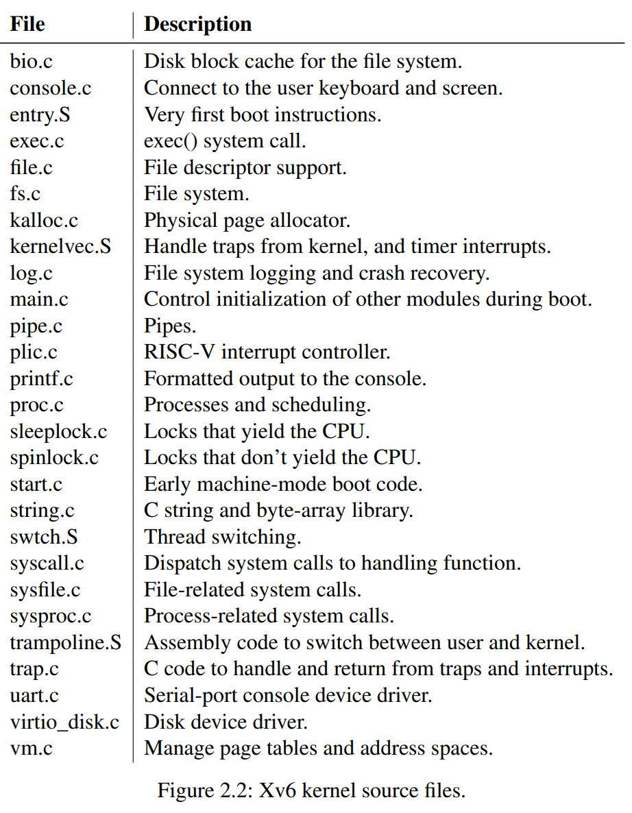 xv6内核源码在kernel/子目录下,按照模块化的概念,源码被分成了多个文件,图列出了这些文件.模块间的接口在kernel/defs.h中定义.
