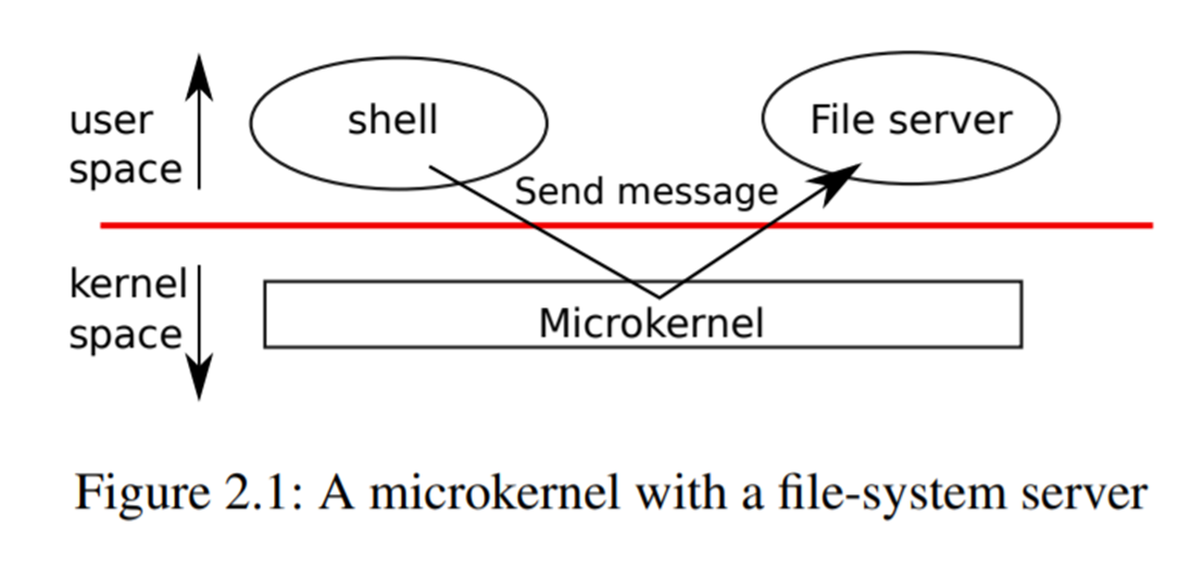 图说明了这种微内核设计.在途中,文件系统作为一个用户级进程运行.作为进程运行的OS服务称为服务器.为了让应用程序与文件服务器进行交互,内核提供了一种进程间通信机制,用于从一个用户模式向另一个进程发送消息.例如,如果一个像shell这样的应用程序想要读写文件,他就会向文件服务器发送一个消息,并等待响应.