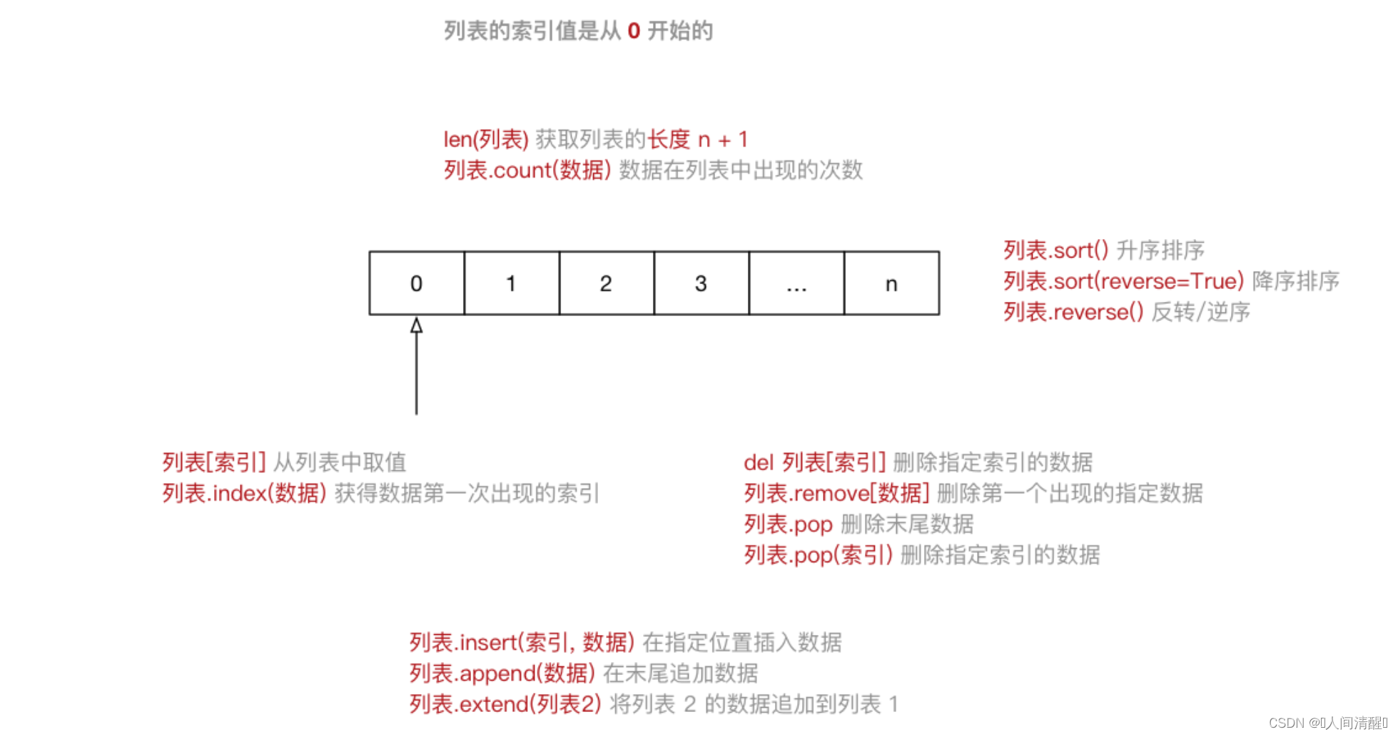 | 5 | 排序 | 列表.sort() | 升序排序 |