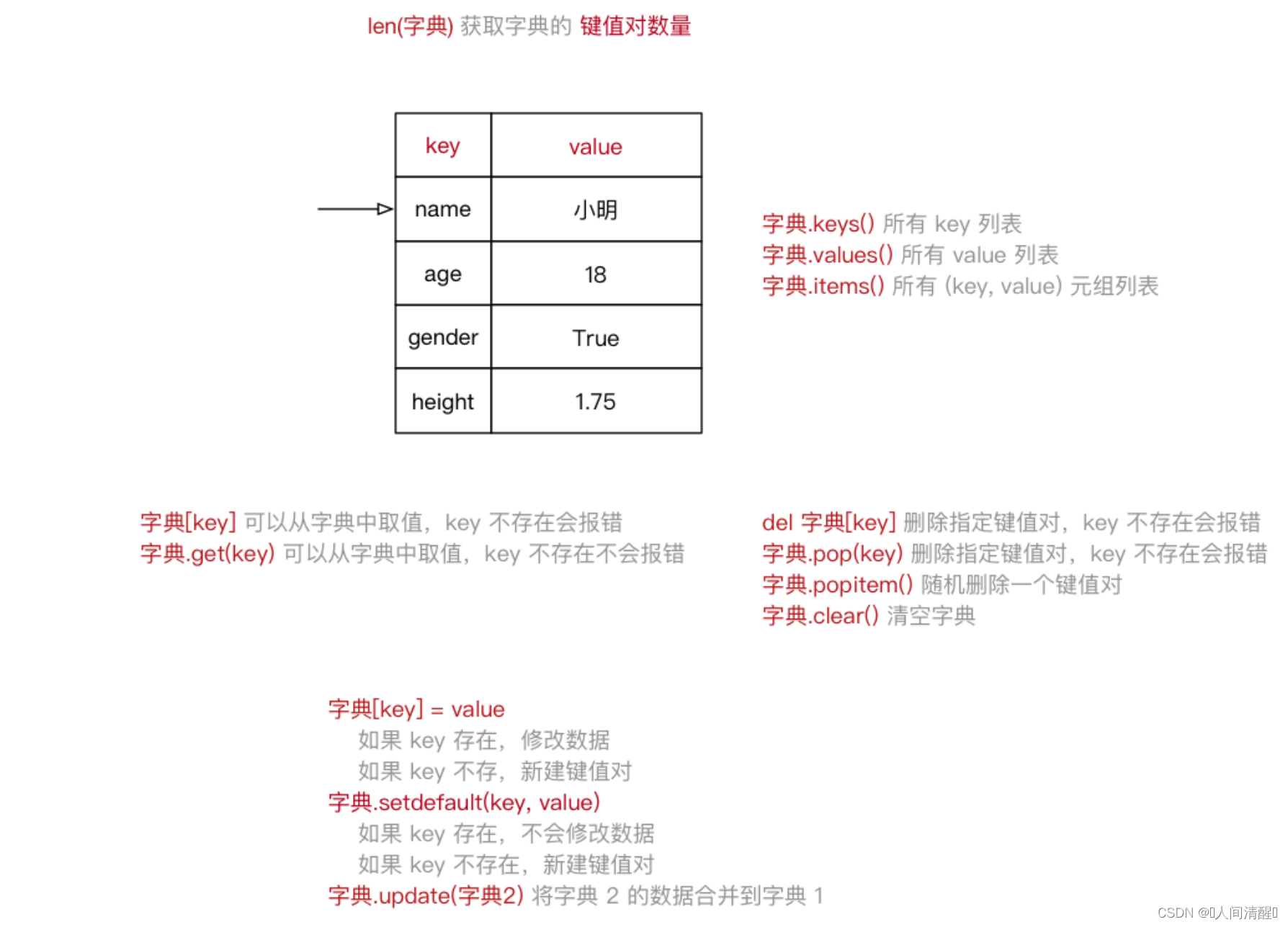 | min(item) | 返回容器中元素最小值 | 如果是字典,只针对 key 比较 |