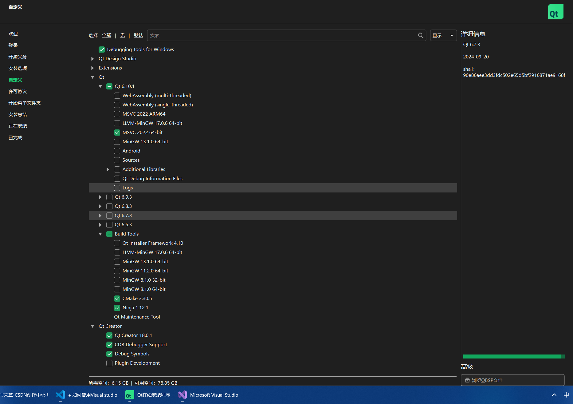 2. 下载qt-online-installer-windows-x64-4.10.0.exe并执行, 在"自定义"一步做如下选择: