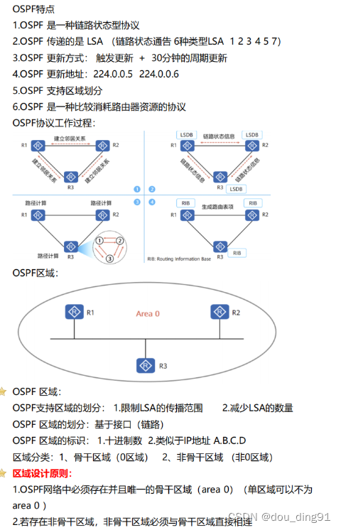 2、OSPF是利用的是LSA有1-7种类型,同时利用的是30分钟周期性更新和触发更新,更新地址分别为:224.0.0.5 224.0.0.6 支持地域划分,比较消耗路由资源协议。