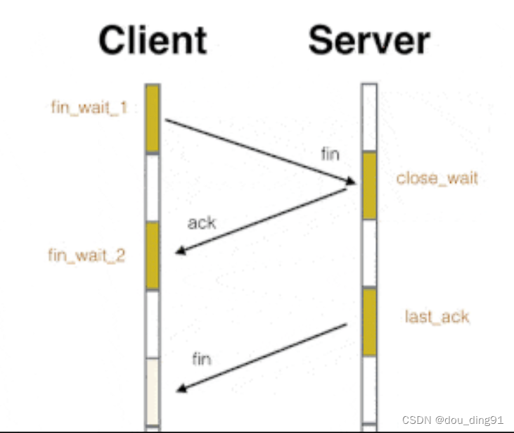 第3次断开:服务端发送一个FIN,用来关闭服务端到客户端的数据传送,服务端进入LAST_ACK状态。