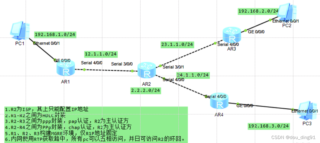 本文详细描述了一个实验过程,涉及ISP配置、HDLC/PPP封装、PPP认证、MGRE环境建立、RIP路由协议以及缺省路由设置,旨在实现PC间互访和对R2环回地址的访问。