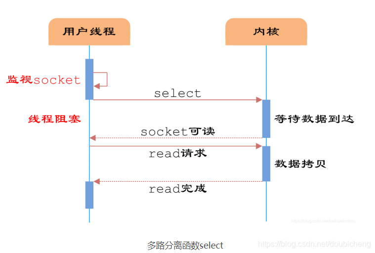 如上图所示,用户首先将需要进行IO操作的socket添加到select中,然后阻塞等待select系统调用返回。当数据到达时,socket被激活,select函数返回。用户线程正式发起read请求,读取数据并继续进行。