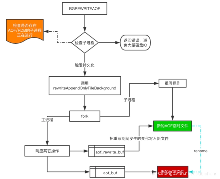 - 为了把重写期间响应的写入信息也写入到新的文件中,因此也会为子进程保留一个buf,防止新写的file丢失数据。