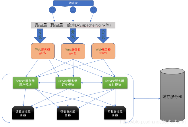 上图web服务器一般以集群的形式,用lvs,Nginx等开源工具做反向代理和API层的负载均衡。业务层service可以用Dubbo等RPC框架实现分布式调用,达到多节点同时处理计算,现在又有一种新的趋势,以springboot框架做微服务进行服务间以restful接口调用,两种形式各有千秋,前者较后都就目前来说更流行一些,在此只关注对性能相关的话题。