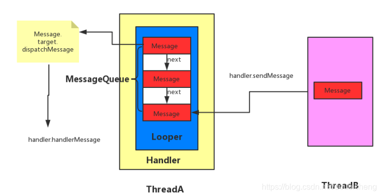 Message在MessageQueue不是通过一个列表来存储的,而是将传入的Message存入到了上一个Message的next中,在取出的时候通过顶部的Message就能按放入的顺序依次取出Message。