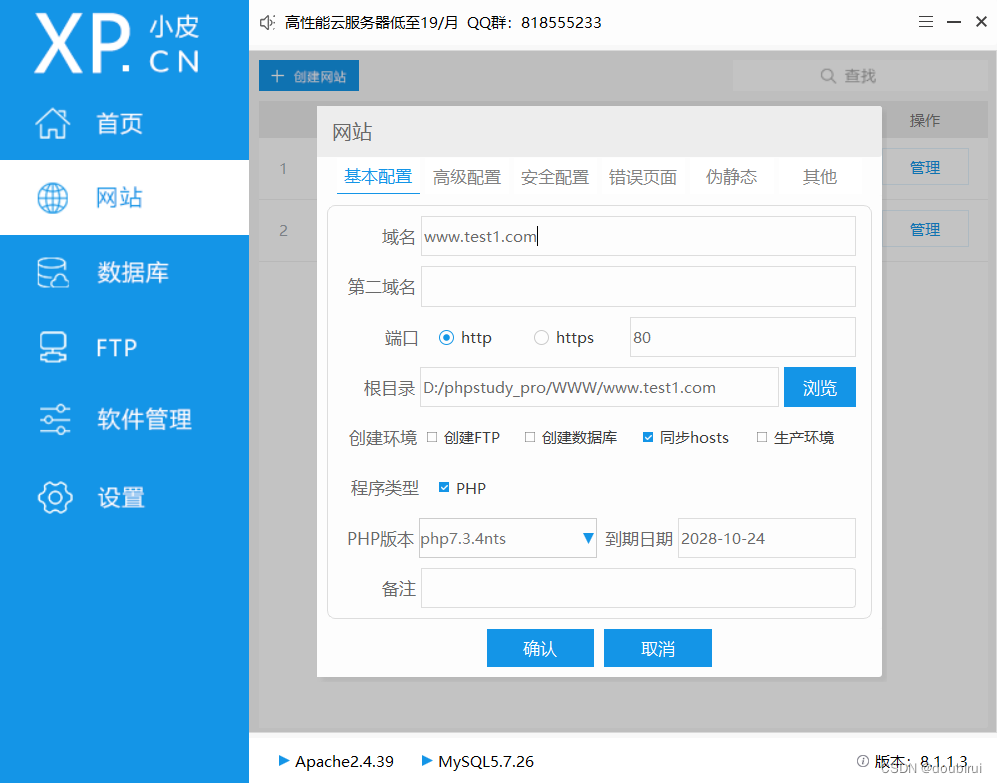 3.点击网站—创建网站,之后进行网站的配置。(切记网站密码)如图: