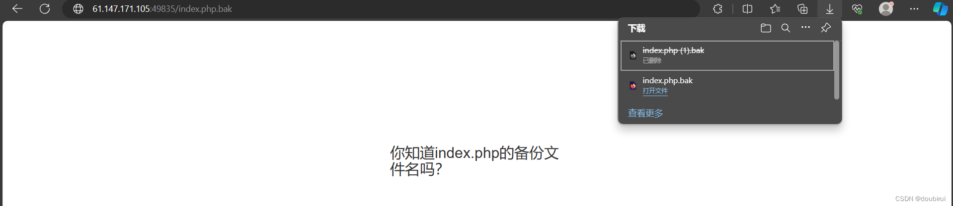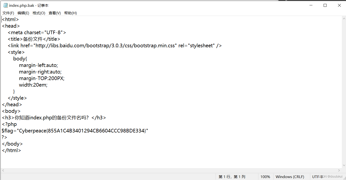 1.通过题目可知此php备份的文件名是以“bak“为后缀的,所以在网址后输入/index.php.bak,后得到一个文件。