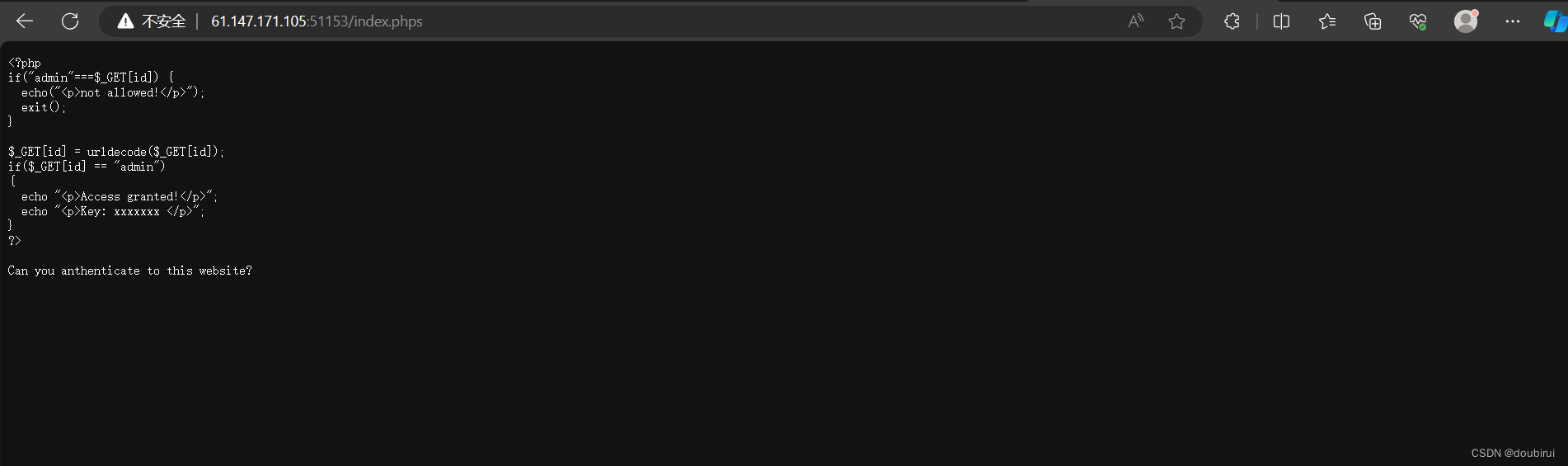 第七行检查“id”参数的解码值是否等于“admin”。如果它相等,则使用“echo”函数显示消息“Access granted!”和一个“key”。