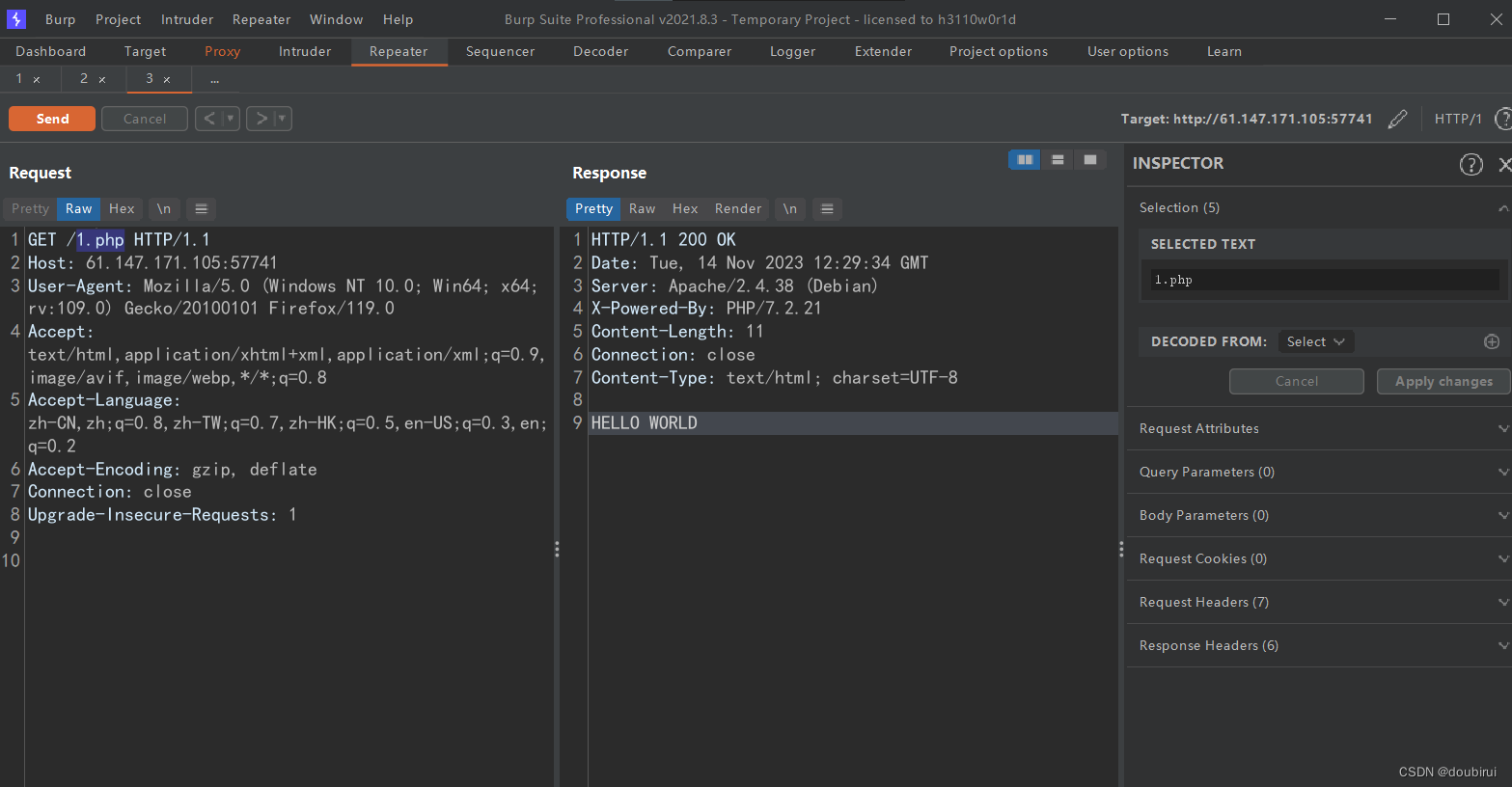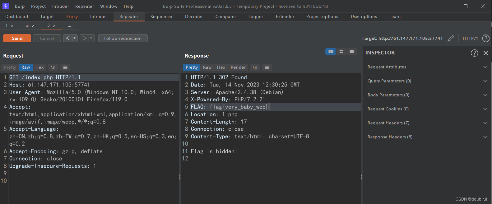 2.因此我们进行抓包,并且发送到Repeater,并将其中的/1.php改为/index.php,再次send,即可得到本题的flag。