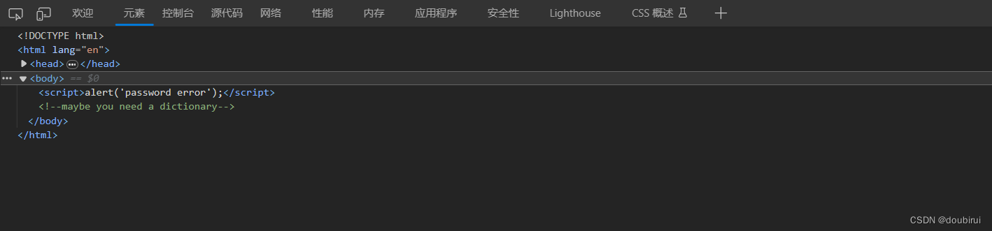 2. 接下来没有提示了,但是我们发现输入错误后他不会返回最开始的界面,而是没有后续了,所以我们不妨打开控制台看看元素。结果发现有一行绿色的字”maybe you need a dictionary“你需要一本字典。这下就明了了,是要让我们进行爆破。