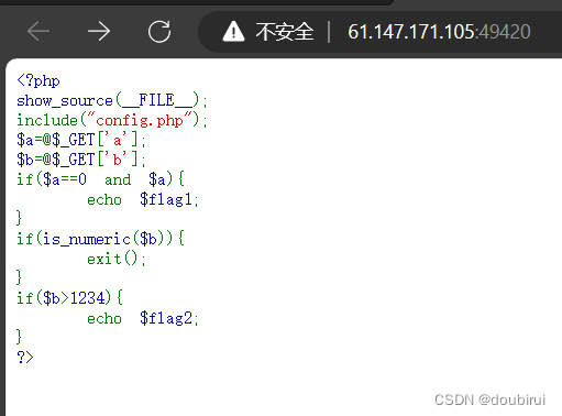 1.定义了两个参数a&b,其中当a=0并且ture时可以输出flag1;当b为数字并且大于1234时可以输出flag2。所以我们应当使a=0,b大于1234。但当我们只输入a=0时,无法得到flag1,这说明a=0时是fales的,所以我们应该输入a=0+任意字母(因为php是弱类型的语言,“==”仅表示数值相等,而且当数字和字母组成的字符串与数字进行比较时,仅会以最前面的数字参与比较。所以a=0asdf,a=0qwer的结果都是一样的,即a=0。)。当我们只输入b=大于1234的数字时,无法得到flag2,这说明b=纯数字时是fales的,所以需要我们后面加上字母。