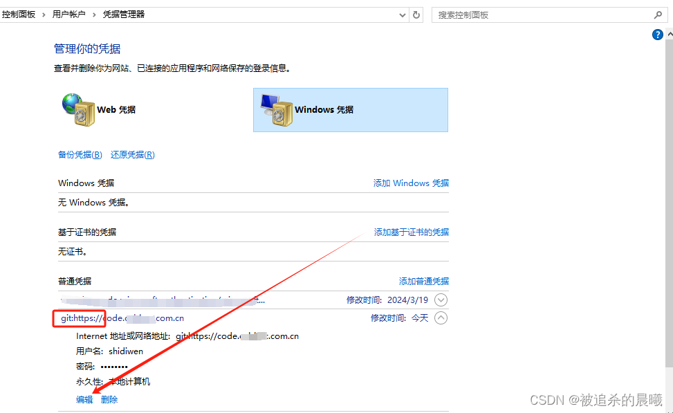 复制个人访问令牌,去计算机搜索凭据管理器,重新编辑git凭据中的密码,也就是把令牌覆盖掉凭据中的密码