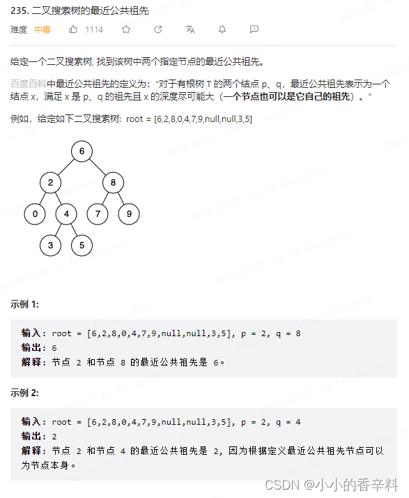 解题的关键是知道自顶向低递归遍历,第一次遇到root在p和q的区间中时,则root就是p和q的最近公共祖先节点。