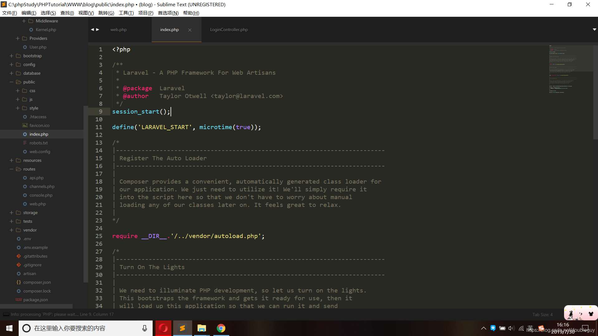 这里其实还有坑,如果是laravel5.2中的话,把server.php改为index.php并加入 session_start(); 即可。如果是laravel5.6,它其实已经有了index.php文件了(这里我被坑死了,我一直按laravel5.2方式,一直错,原因就是session没开启成功),他在public目录下,在这里的头部加入session_start(); 就可以了。