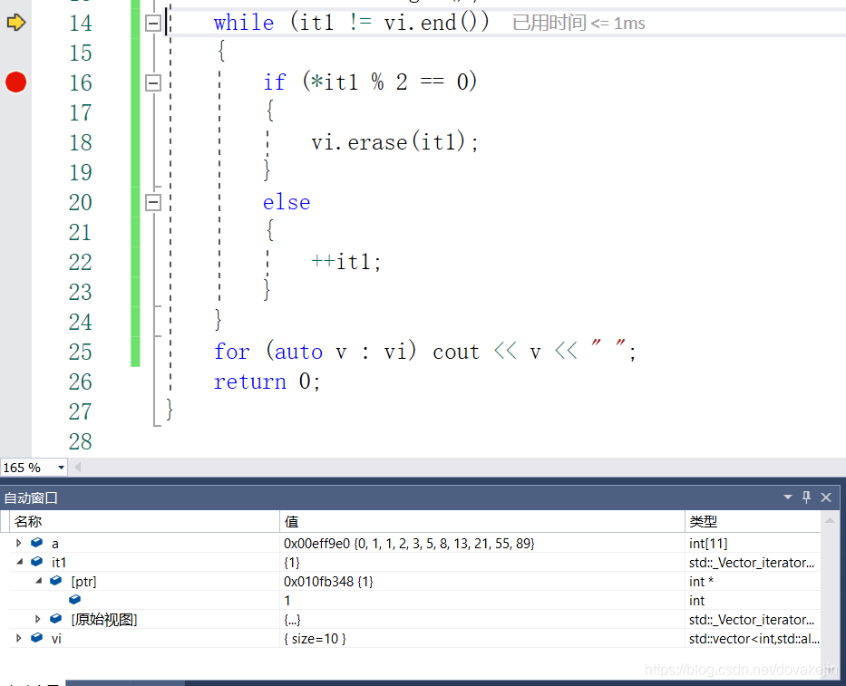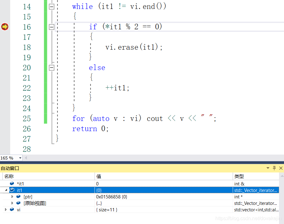 然而这个回答没有消除我的疑问,因为在单步调试时出现了下面的情况,似乎每一步都是合理的,指向被删除的元素的迭代器确实成为指向下一个元素的迭代器。