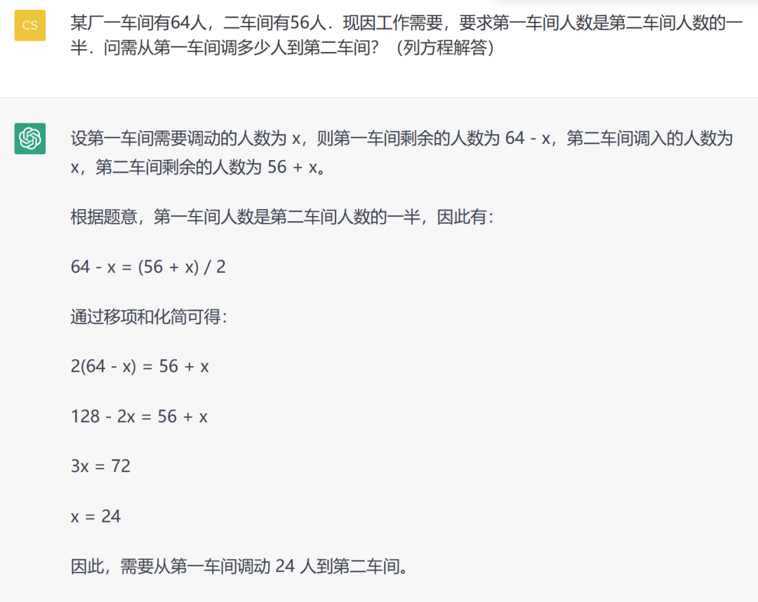 提问:某厂一车间有64人,二车间有56人.现因工作需要,要求第一车间人数是第二车间人数的一半.问需从第一车间调多少人到第二车间?(列方程解答)