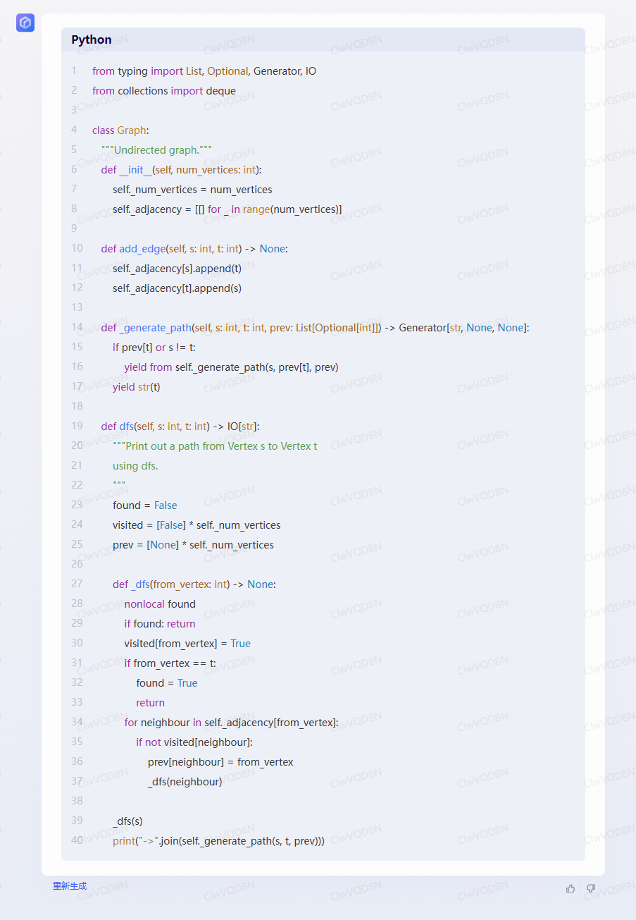 2. 「文心一言」虽然生成了代码,但是生成的是图深度优先搜索(Deep First Search)代码,并不是目标问题解法代码。