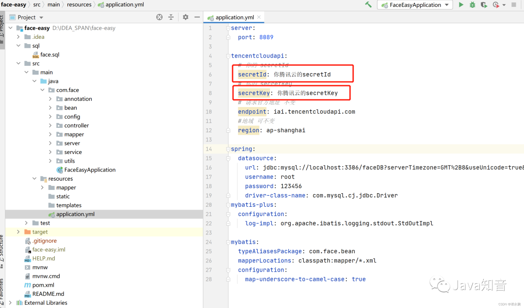 4,获取secretId和secretKey,并开通人脸服务之后,将secretId和secretKey配置到yml文件中