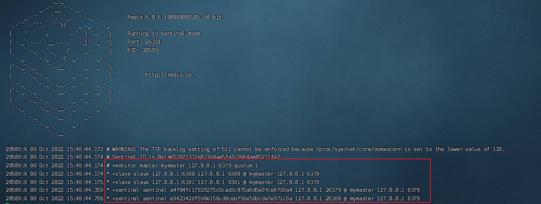 从哨兵的启动日志中我们可用看到主从服务器的信息,以及其他哨兵节点的信息