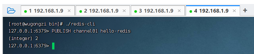 第一步:发布者 1 往 channel01 中发送消息 "wugongzi"