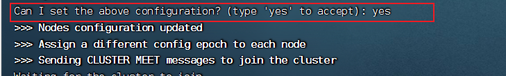 $ redis-cli --cluster create 127.0.0.1:7001 127.0.0.1:7002 127.0.0.1:7003 127.0.0.1:7004 127.0.0.1:7005 127.0.0.1:7006 --cluster-replicas 1