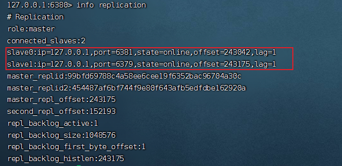 此时我们通过 info replication 命令查看集群信息,发现 6380 已经是主库了,他有一个从节点 6381