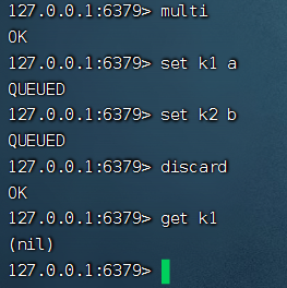当执行 discard 命令时, 事务会被放弃, 事务队列会被清空, 并且客户端会从事务状态中退出